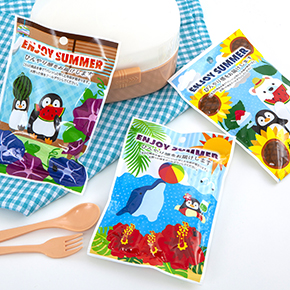 表面は愛くるしいアニマルたちが夏を満喫している様子、裏面はハガキを模した取扱説明書がデザインされており、 まるで暑中お見舞いのようにひんやり感をお届けします。