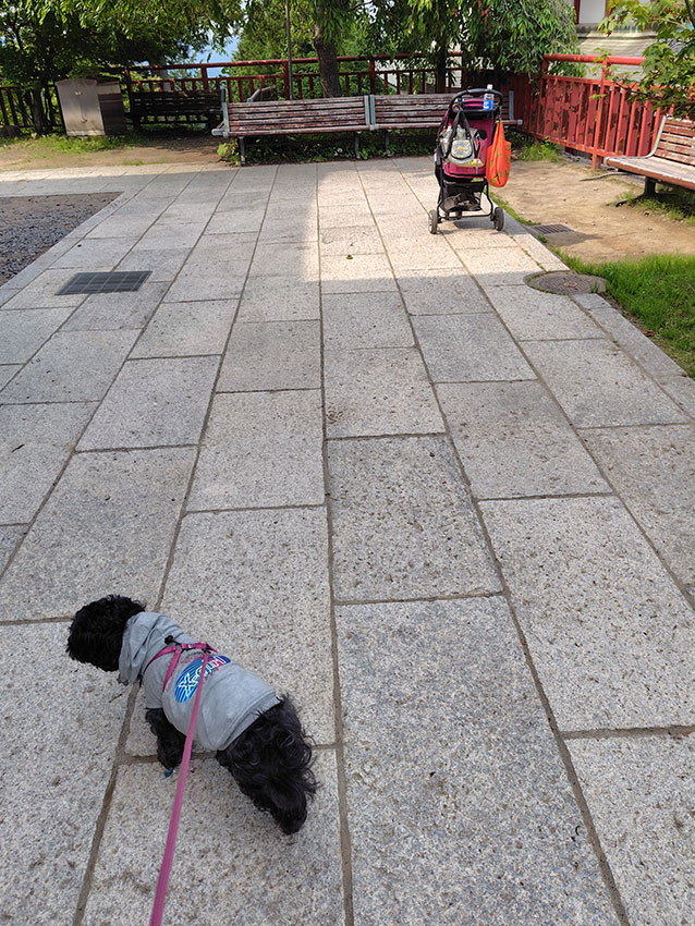 老犬が歩いて登るのは難しいので、カートに乗せて山頂まで。