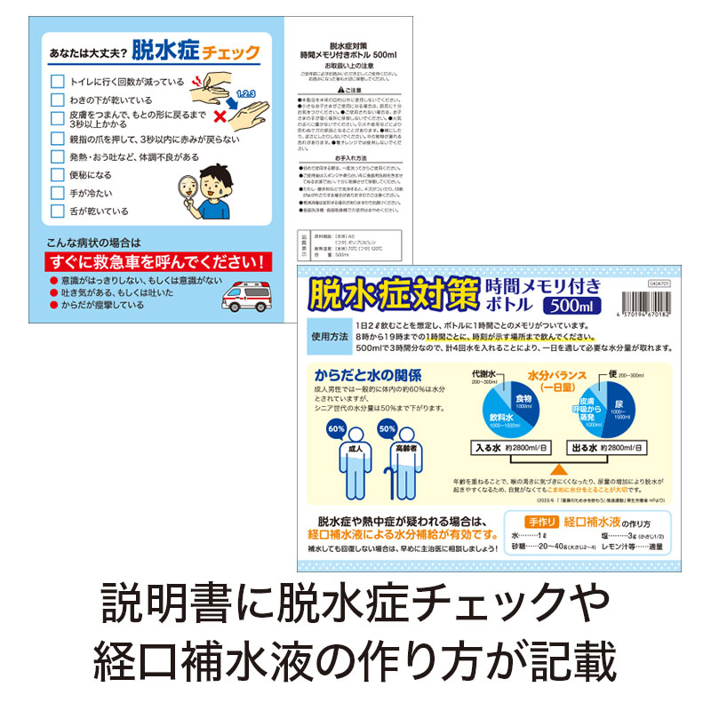 透明袋入り脱水症対策 時間メモリ付きボトル 500ml
